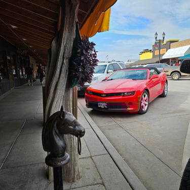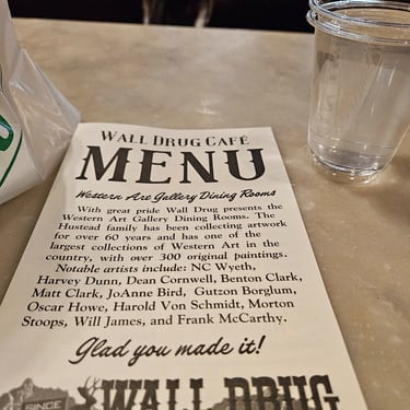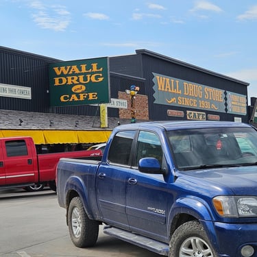 Nothing much to report about Pierre, South Dakota. More driving through endlessly undulating prairie land and skirting the Badlands finally took me to Wall, SD and the "famous" Wall Drug and Cafe. It was a fun tourist spot with a bunch of little stores including a book store, a leather store, a native American art gallery, and, of course, the drug store section.