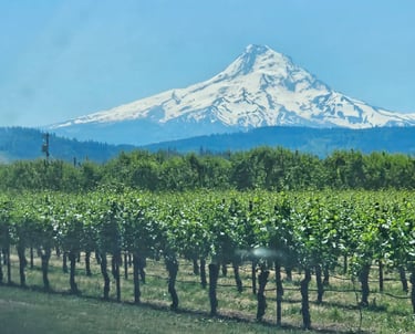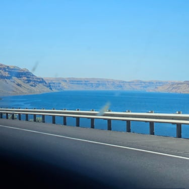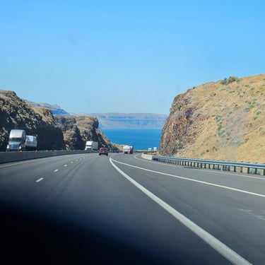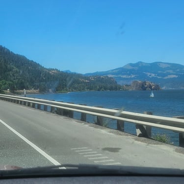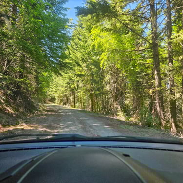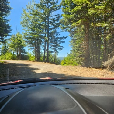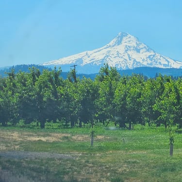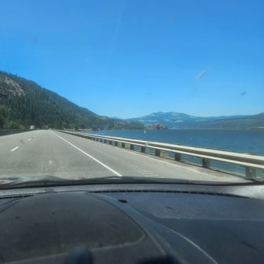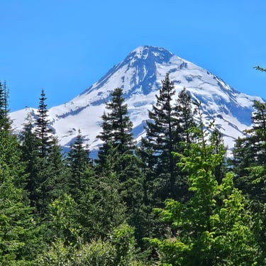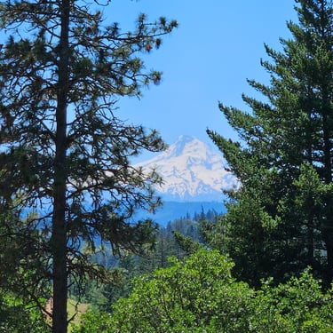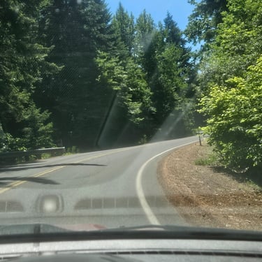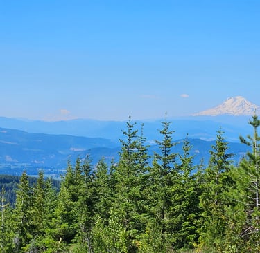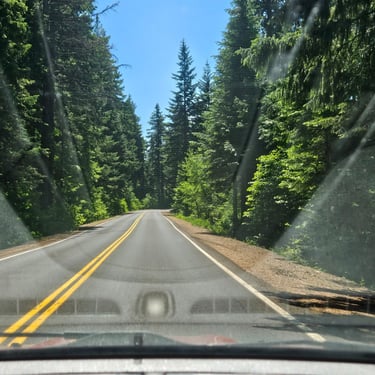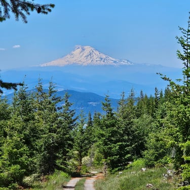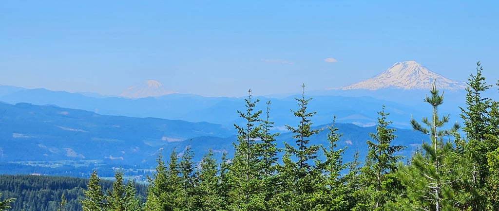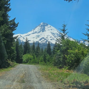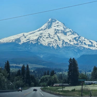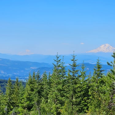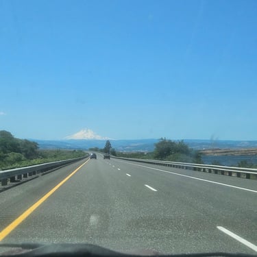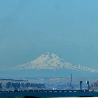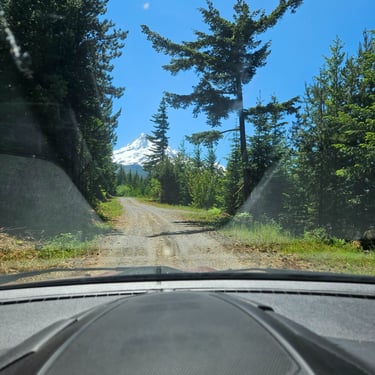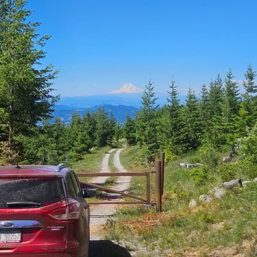 Crossing Eastern Oregon is a whole lot of empty, but eventually I made it to the Columbia River Gorge and on such a clear day, Mt. Hood started to become visible from a very long way off. Interstate 84 basically follows the gorge, so I stayed on that route up to Hood River. I got lunch and gas and then there was no way I could pass up the opportunity to get higher up the mountain, so I left the interstate, and drove up Mt. Hood. I found a logging road and had a bit of an adventure driving its winding path until I got to a spot where I could see Mt. Hood's snowy peak up close and personal, but in the opposite direction got a nice clear shot of Mt. St. Helens way off in Washington State.